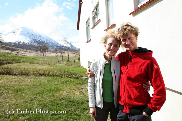 The ski quiver, and then guide Jokull Bergmann and his mom, Anna Dora, outside their farmhouse/ski lodge (Klaengshol) in northern Iceland – the base of operations for Bergmenn Mountain Guides