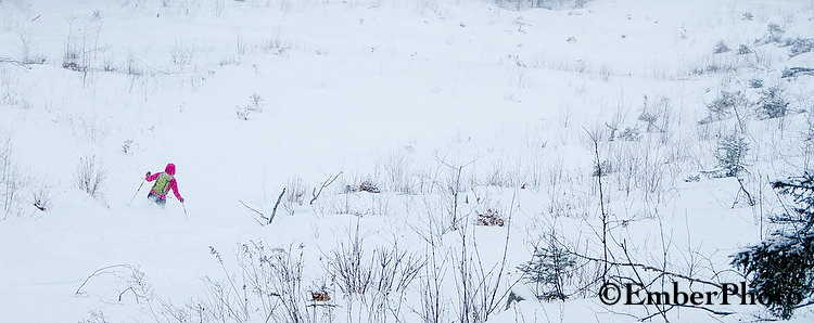 On top of many delectable days spent touring for backcountry powder, it was the gradual build up of the snow pack and the doors it opened into steeper terrain that was one of the more exciting elements of the New Year snow cycle. By the first week of January, we were already sliding into many tree lines, steep creeks and gullies that often don’t lure us in until February, or later. Even in the steeper alpine zones of the Whites and Adirondacks, daily small accumulations of snow gradually filled in terrain that often remains scoured this time of year. This pattern also helped to prevent larger avalanches that strip alpine terrain right back to bare rock and ice.