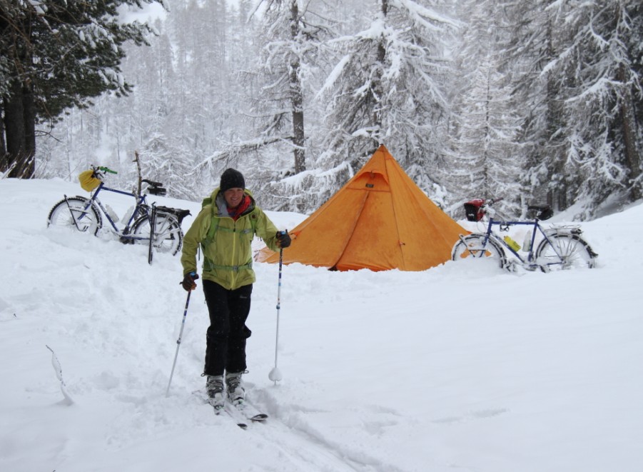 A glorious stretch of spring prevailed as we pedaled and skied our way through the Austrian-Italian border region just east of Switzerland’s Engadine Valley – a stretch that had us pushing to the high peaks of the South Tirol (home of legendary alpinist Reinhold Messner) and Ortler regions (where we pedaled and then skied out to a great mountain hut above Solda, Italy), savoring the tastiest pizza of our lives, dipping our heads into streams and wondering if our luck with the weather would keep up.