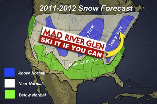 Many forecasters believe the coming winter could be another snowy one for the mountains of the northeast, thanks in part to a prevailing La Nina condition in the Pacific and the effect this could have on the jet stream pattern for our region. According to the report on Accuweather.com’s Meteorloical Madness blog, “…The cold will be back in the Appalachians, and that will lead to heavy snow in that area.” Sounds good to us! Take a look at the graphic above (courtesy Accuweather.com) and read the full report on the Accuweather.com website HERE. Then again, Mad River Glen’s take on the forecast is worth a look, too (below).