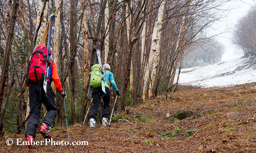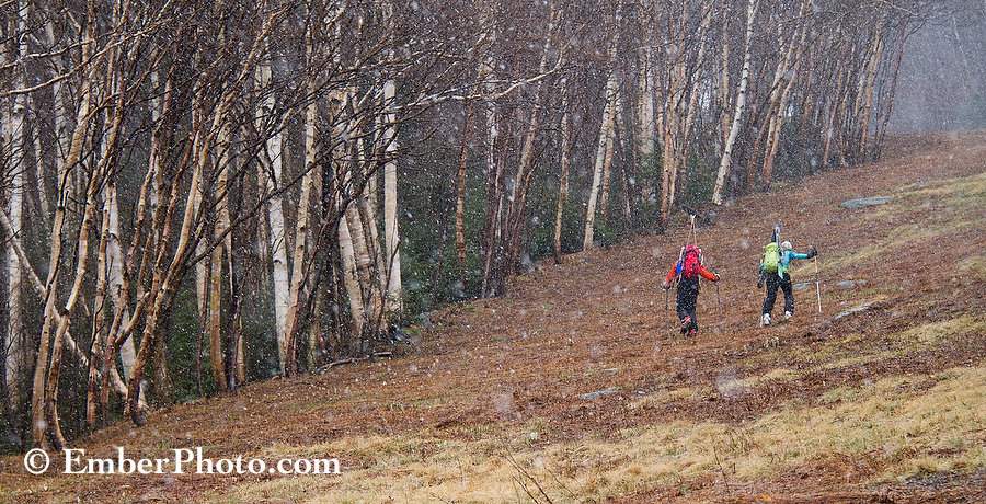 As Mother’s Day approaches, it looks like Mother Nature is treating herself to one last glimpse of winter’s beauty in the mountains. It will likely be snowing in the high Adirondacks just a few hours after I write this, and by midnight, it should be snowing steadily up high in the Greens and Whites, too…With enough moisture still streaming over the next 36 hours, fresh tracks in the binding-deep to shin-deep range could reward skiers willing to climb and ski for turns – especially on Thursday afternoon and very early Friday morning. There’s still plenty of coverage up high and out of the sun, and with some sufficiently dense snow on Thursday, even medium to lower angle ski area trails that have already lost most their coverage (at friendly ski areas that allow skinning) could become very fun to ski again Thursday and Friday morning. Snow may have a tough time accumulating below 2500′, so don’t let the rain in the valleys deter you.