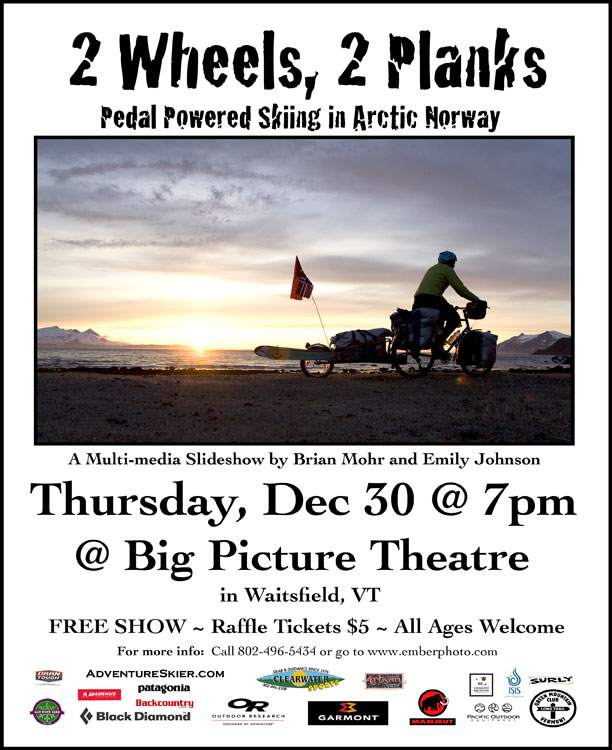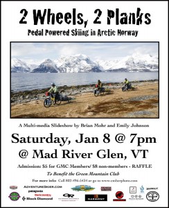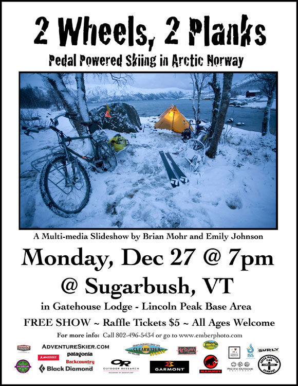After enjoying the fresh snow on Monday…Please join us for a celebration of human-powered skiing adventure at one of our three upcoming slideshows: Monday 12/17 at Sugarbush, VT (in the Castlerock Pub in the Gatehouse Lodge), Thursday 12/30 at the Big Picture Theatre in Waitsfield, VT and Saturday Jan 8 at Mad River Glen. All shows starts at 7pm, include a big raffle of outdoor gear, and are family friendly. Please feel free to spread the word.