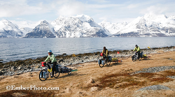 Vermonters Forrest Twombly, Emily Johnson and Thomas Hite, with their skiing and camping gear in tow, pedal away from their seashore camp near Djupvik, Norway en route to a ferry that will lead them to the mountains across the fjord.