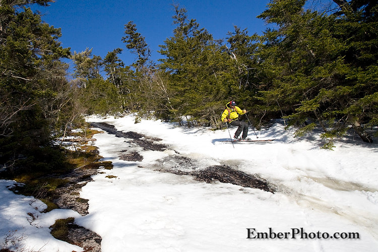 Rather, we were close to home in the northeast on Monday, heading to Vermont’s Bolton Valley after running a few long-neglected errands in the big city of Burlington, VT. Along the way, we alerted some friends of our ski plans, thinking some of them would like to join us. None of them responded. Understandably, too. Puddles were slowing traffic on the highway. There was water running across the access road to Bolton Valley. Still, we had a feeling it was going to be worth it.