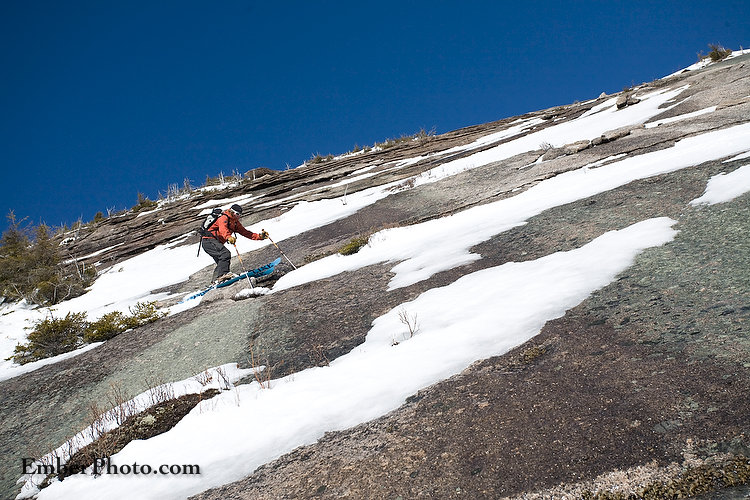 Although Friday was officially the last full day of the winter season in the northern hemisphere, it seems as though spring has been having its way with us for nearly two weeks now here in the northeast: flowers are starting to bloom, we are cutting spinach again from our garden (it wintered over in our cold frames!), and the snow seems to be all but gone from our valley floors… And while snow depths at high elevations are at their near-peak levels for the season, we managed to find a some beautiful lines in a steep, south-facing alpine zone that would have been unskiable had we shown up a day later. This line, for instance – on a mountain in the far northern White Mountains – barely let us through…