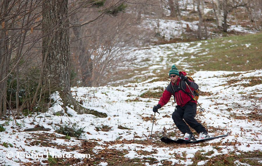 Meanwhile, Matt Davis (below), our maple-sugaring, yurt-living, science teaching friend, dressed up like a regular skier, not wanting anything to interfere with his first test run on the extra pair of Marquette skis which we had brought along for him. After taking a look up the mountain, which had melted back a bit over the last few days, he was glad to leave his skinny and delicate rock skis – with their vulnerable edges and ptex bases – behind. An hour later, and a few turns into his run, Matt seemed sold on the go-anywhere, ski-anything nature of the Marquettes – which may just be the ultimate thin-cover quiver ski.