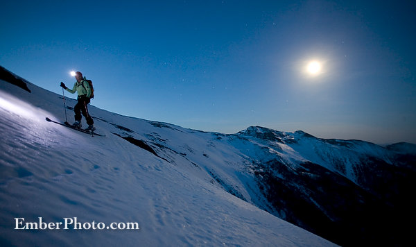 Record warmth graced the summits of the Northeast’s highest mountains this past weekend, and with the moon still nearly two-thirds full on Friday evening, we couldn’t resist the idea of a few turns on moonlit corn. Near-perfect corn snow was in effect up to approx. treeline, and above treeline, the snow surface was a rare and delectable “crispy corn” – corn snow topped with the most delicate of crusts, thanks to a tad bit of radiational cooling… It was beautiful skiing, and the perfect warm up for some equally beautiful sunrise skiing.