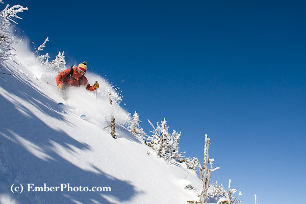 Skier Ian Forgays enjoys a blue sky powder day at treeline in Vermont’s valium generic pill identifier Green Mountains.
