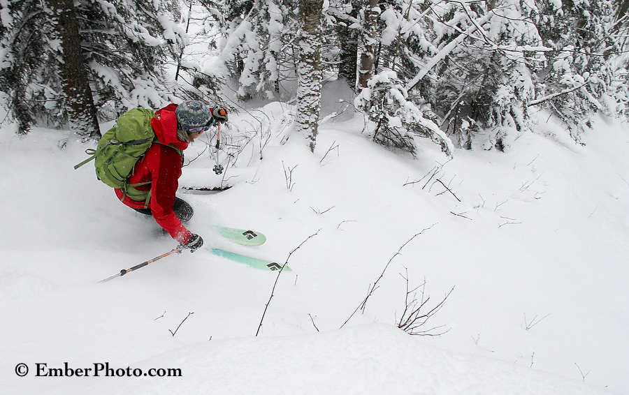 Scattered snow showers continue to add precious white snowflakes to our relatively thin snowpack across the Northeast, with up to 4″ of Champlain Powder falling around VT’s Mt. Mansfield on Thursday. While most off-piste lines still need quite a bit of natural-snow base, others are really starting to take shape. The first image here was captured on Thursday while skiing one of our favorite creek lines on Vermont’s Mt. Mansfield, near Stowe. (Please click on thumbnails below to view enlargements.) The second image was captured a few days ago during a beautiful sunset, from the heights of the Green Mountain divide. While the snowpack might be thin out there, fresh snow is beginning to load up nicely at higher elevations on the usual leeward aspects/pockets. And the overall challenge of the conditions adds some really nice flavor to the experience of being out there on skis right now… – Brian
