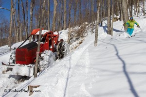 Some of the logging taking place in the northeast these days is opening terrain and in some cases helping to improve the off-piste skiing. This is true for a while at least, or until the underbrush starts to flourish with all the new sunlight passing through the canopy. However, if enough good-sized trees are left standing, the canopy can do a pretty good job of closing itself back up. For the moment, it’s pretty fun to be skiing with the skidder…