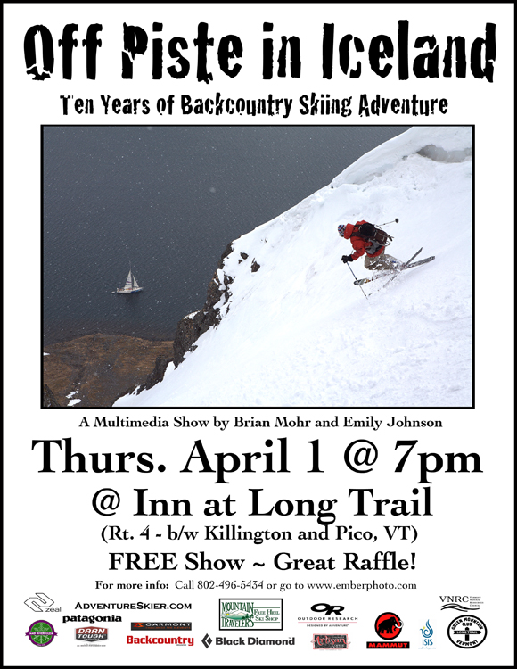 Don’t miss our next slideshow, Off Piste in Iceland, coming up on Thursday, April 1 at the legendary Inn at Long Trail along Rt. 4 near Killington, VT. Owners Murray and Patty McGrath have hosted a few of our shows in the past, and we are excited to be back there once again this season. Come early or stay late to enjoy some great food and tasty Guinness at McGrath’s Irish Pub (inside the Inn), or simply join us for our latest presentation featuring nearly ten years of backcountry skiing adventure in the Land of Fire and Ice. If you are feeling lucky, we will be raffling off two pairs of Black Diamond “Kilowatt” skis, along with loads of other outdoor gear, at the end of the show. Raffle tickets will be sold at the door for $5, and proceeds will support our ongoing conservation work with organizations in the Arctic, the Andes and here in Vermont, including the GMC and the VNRC. We’d greatly appreciate your help in spreading the word! Thanks!