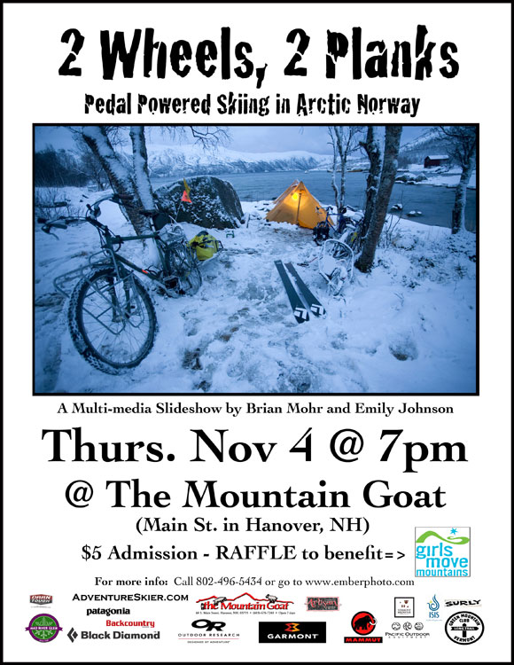 Hanover, NH – On Thurs,Nov. 4 at 7pm, Vermont-based photographers and adventurers Brian Mohr and Emily Johnson will bring their latest show, “Two Wheels, Two Planks – Pedal Powered Skiing in Arctic Norway” to The Mountain Goat on Main St. in Hanover, NH. The show features the couple’s recent bike-powered skiing exploration of Norway’s Arctic Alps, and will benefit Girls Move Mountains. It is part of the duo’s ongoing Wild People, Wild Place Slideshow Series, which features ten shows throughout the upcoming winter season.