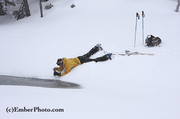 Not too long after lunch time, with our hut no where in sight, we munched on the last of our morning “snack” – cheese and crackers, carrots and chocolate. And by 4pm, after more than eight hours of climbing and skiing, we were out of water…and thirsty. With 2000′ of climbing before us, we scouted for an access to one of the creeks flowing beneath the deep, late-winter snowpack before discovering an open inlet to a nearby pond…