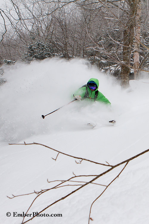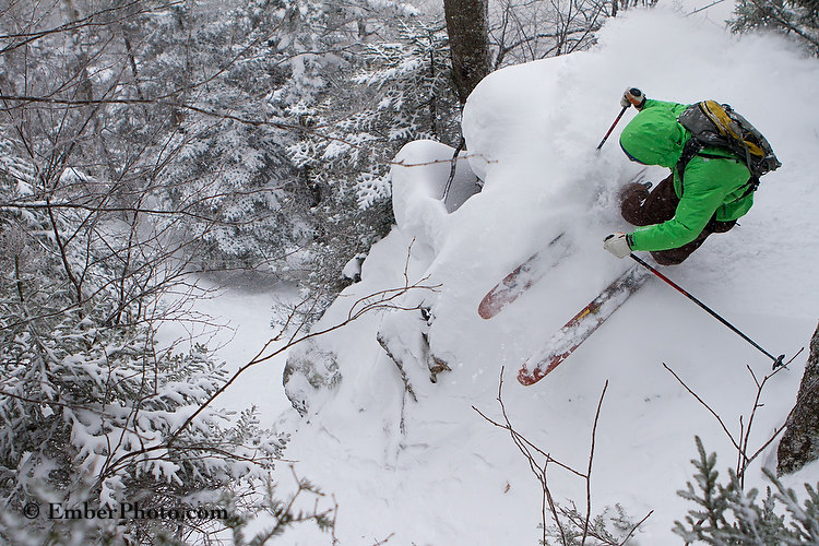 Although the backcountry and nordic crust-cruising has been in its element recently, today’s snow was a welcome treat from our good friend Old Man Winter. A good 6-8″ of fresh snow has piled up across the north country as we write this on Friday evening, and it looks like several more should be awaiting us by sunrise on Saturday. Here are a couple of shots of Andy Weis, one of the coaches of Mad River Glen’s Freeride Team, hard at work.